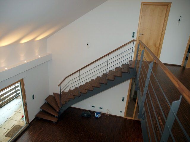 Einer der Schwerpunkte unserer Firma ist die Herstellung von selbsttragenden Wangentreppen, lizenzierten Bolzentreppen, Stufen sowie Geländer, auch kombiniert mit Edelstahl, Glas und geschmiedeten Elementen.